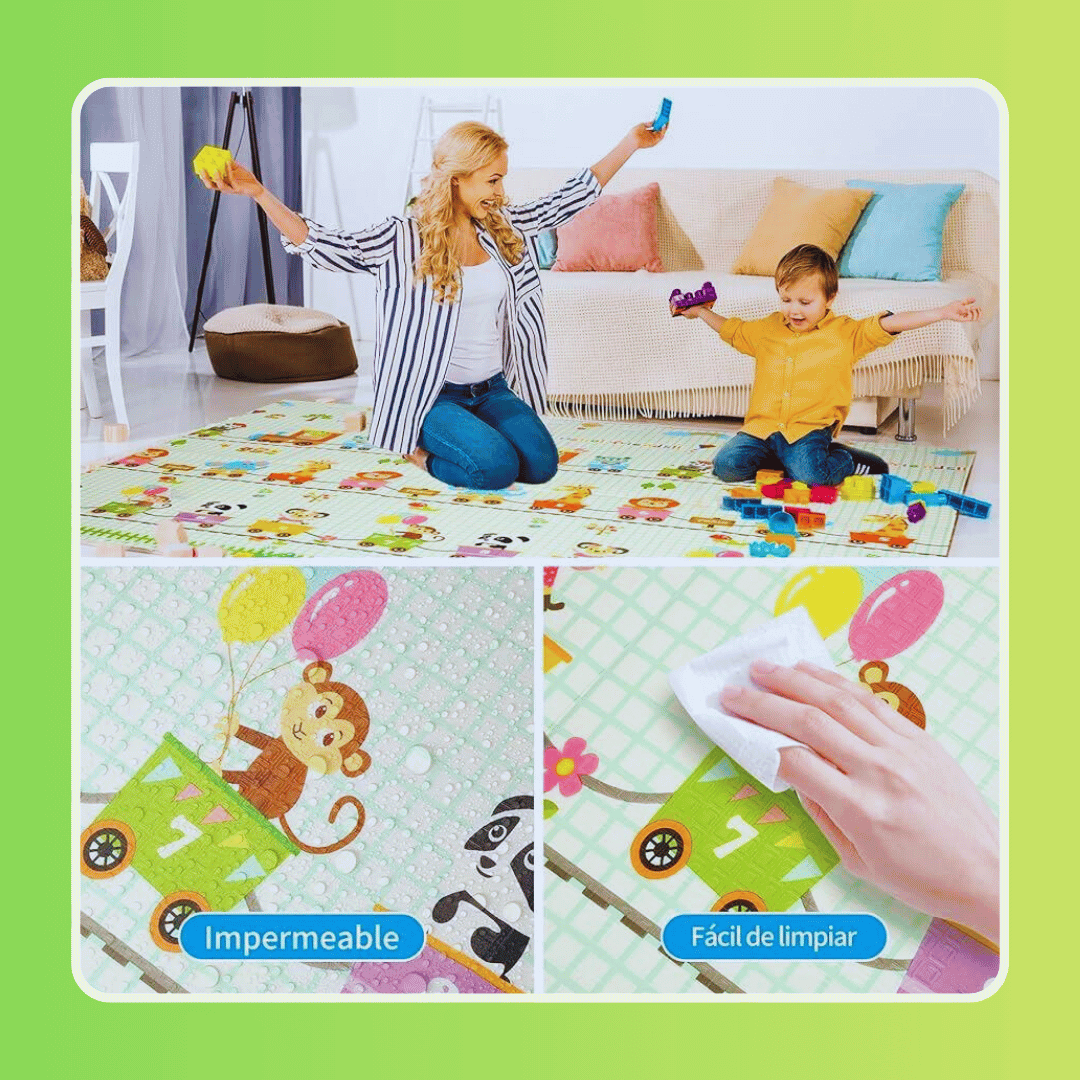 Significa que obtienes dos diseños en una sola alfombra. Un lado tiene divertidos motivos de animales para estimular la curiosidad de tu bebé, y el otro tiene un patrón diferente y educativo. Puedes cambiar el diseño cuando quieras, manteniendo el espacio de juego fresco y divertido.